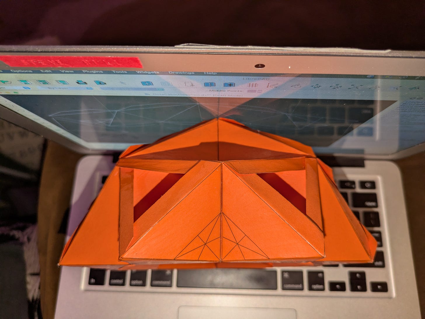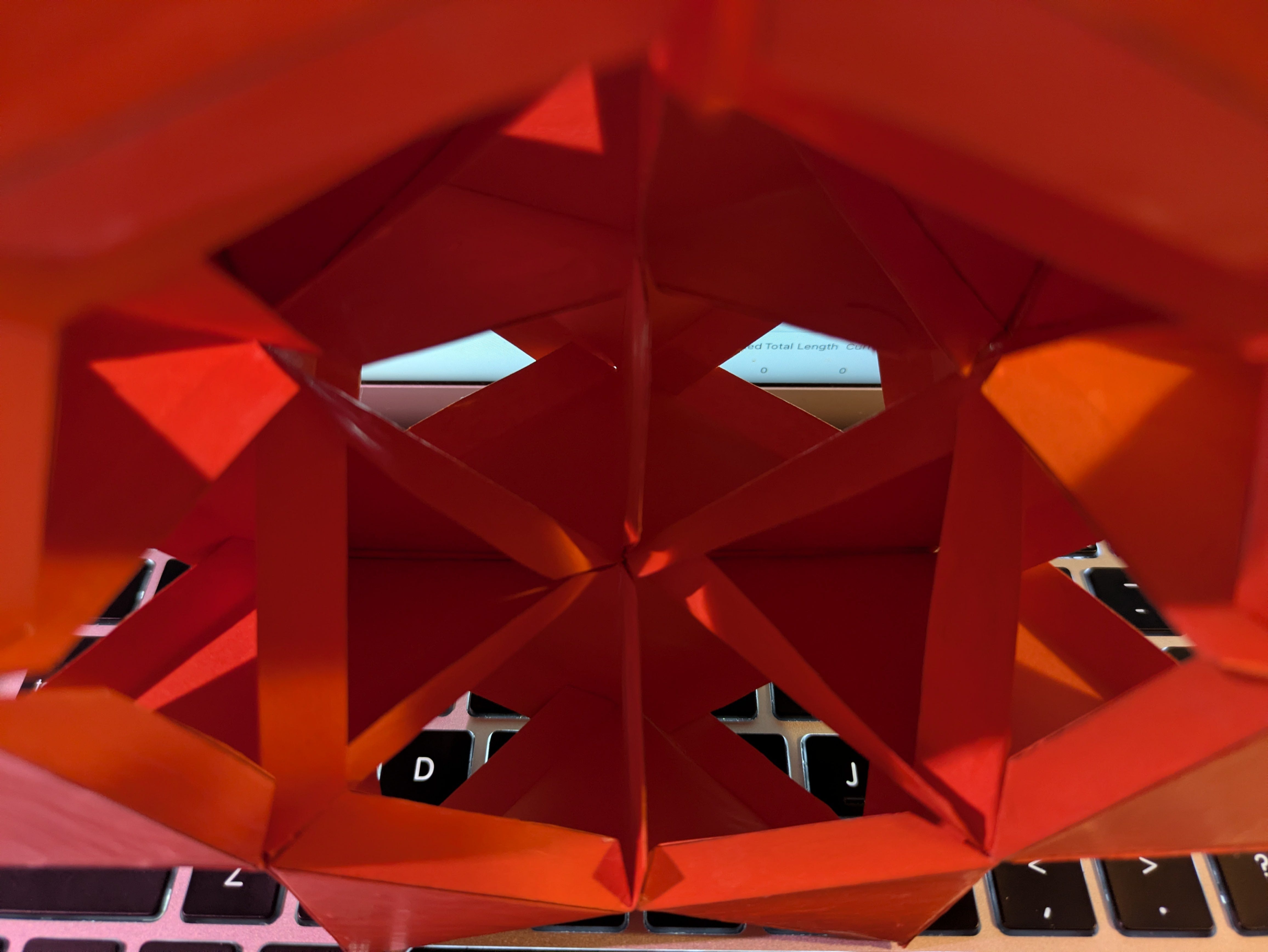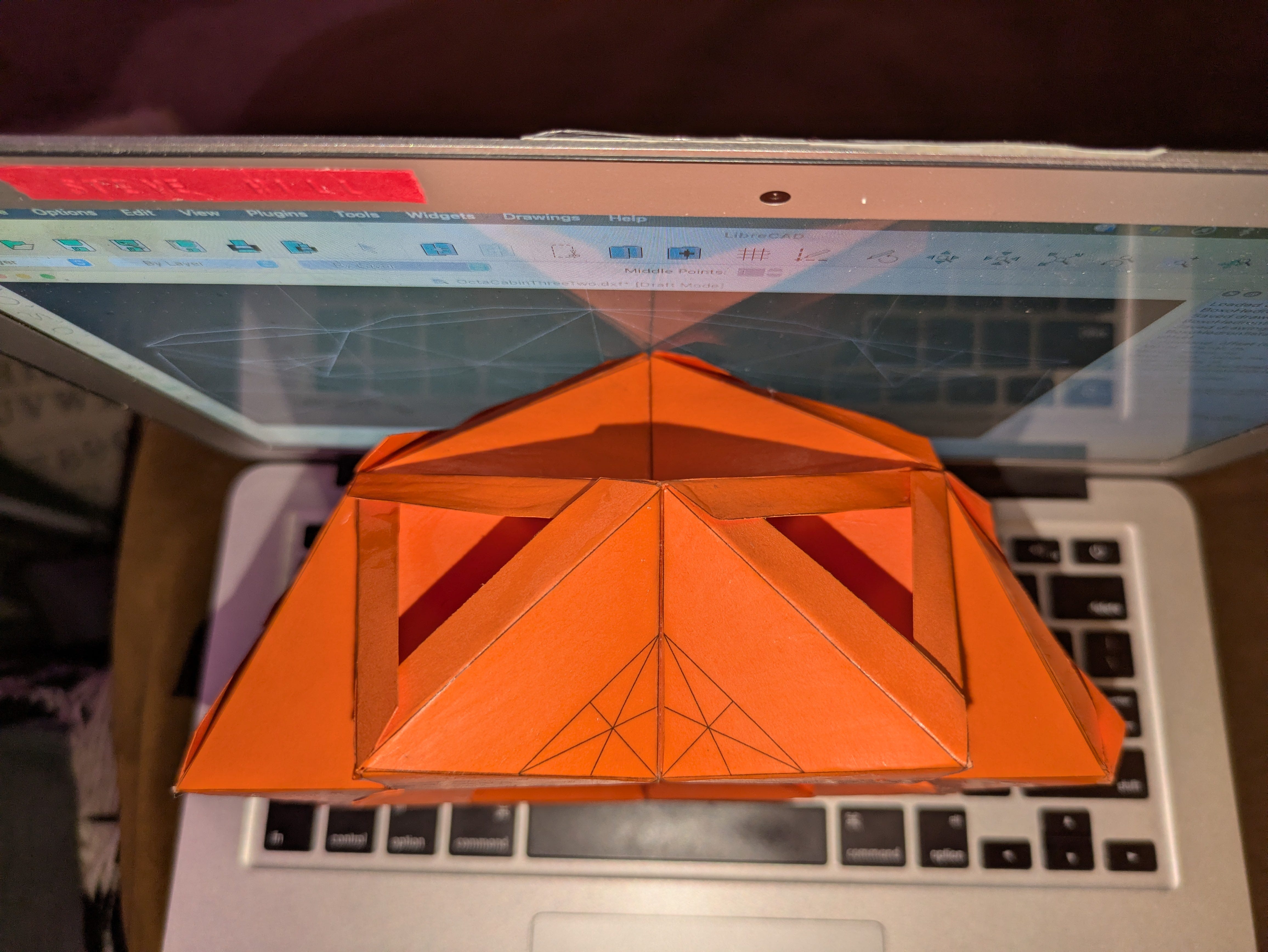 What I especially like about this technique is the volume is developed from a flat sheet, simply folding creases and fastening a”glue tab” makes an octahedron “missing” two faces. No mucking about with hubs and struts. Those faces are your inner and outer windows, respectively. Likely it is thicker than it needs to be; I find thicker shapes to be easier to work with paper-wise. If this was a larger structure made, say, out of sheet metal, those triangles could be much thinner. This has the added advantage of allowing a roll of sheet metal to be stamped out quickly and efficiently on a assembly line, should one so desire (and have access to that kind of capital outlay, of course).