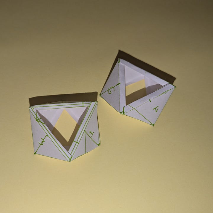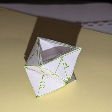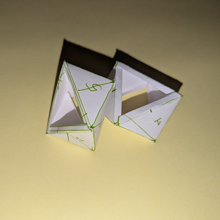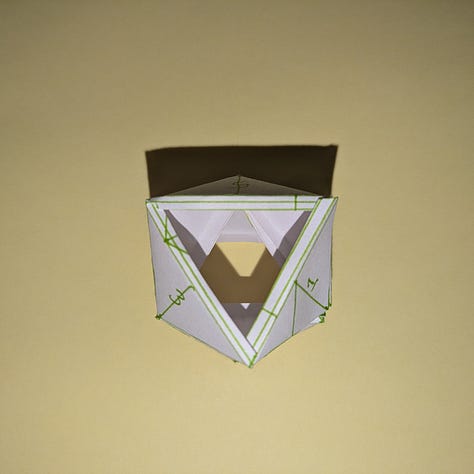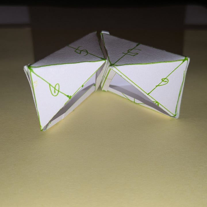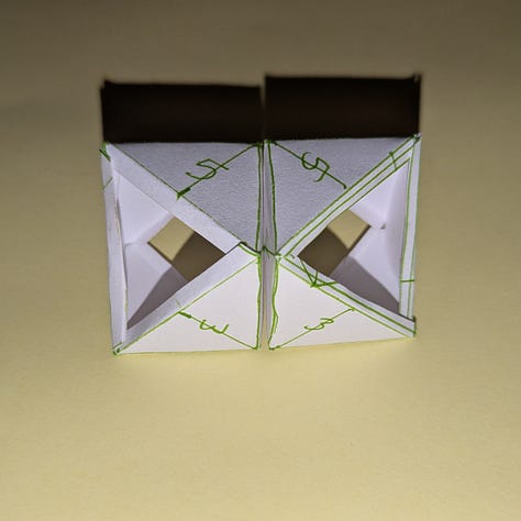 I'll be treating this as a kind of fidget spinner and will have future posts where I make some more developed models, all, of course, with paper and glue stick, but it seems to be my working aesthetic right now. Enough of these put together would make a rather interesting octahedral pyramid that has some real sci-fi qualities to it.