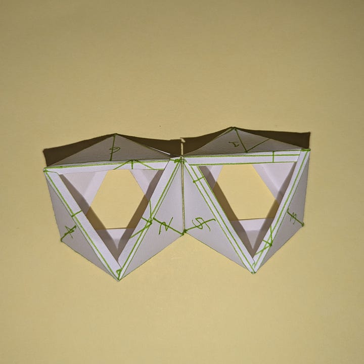 You could connect them together by gluing in tetrahedrons to have a true octahedron tetrahedron truss, or you could just use circles at each of the vertexes, glue those on which I haven't shown here, but once I find where my hole punch is I will get to that later.