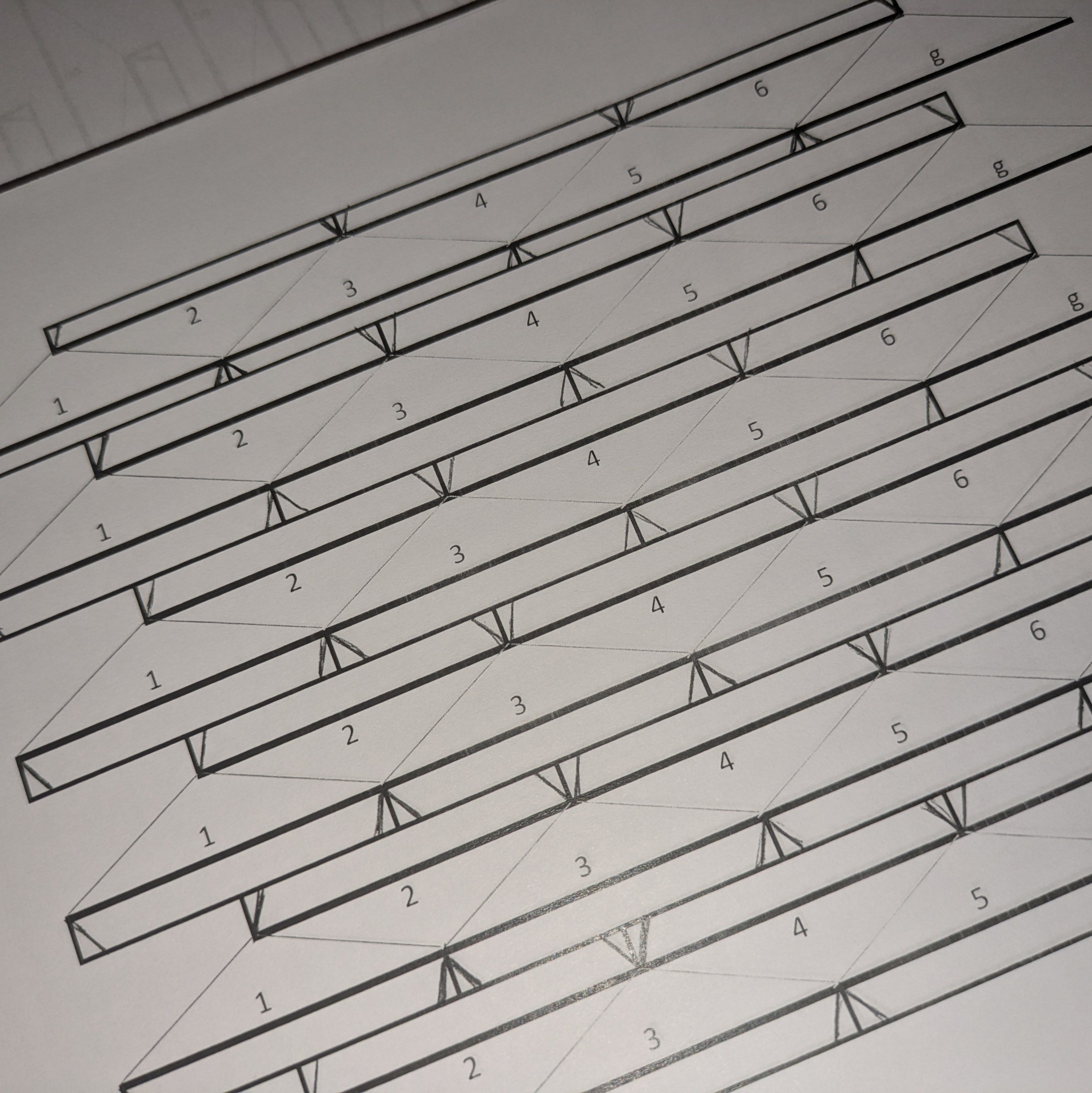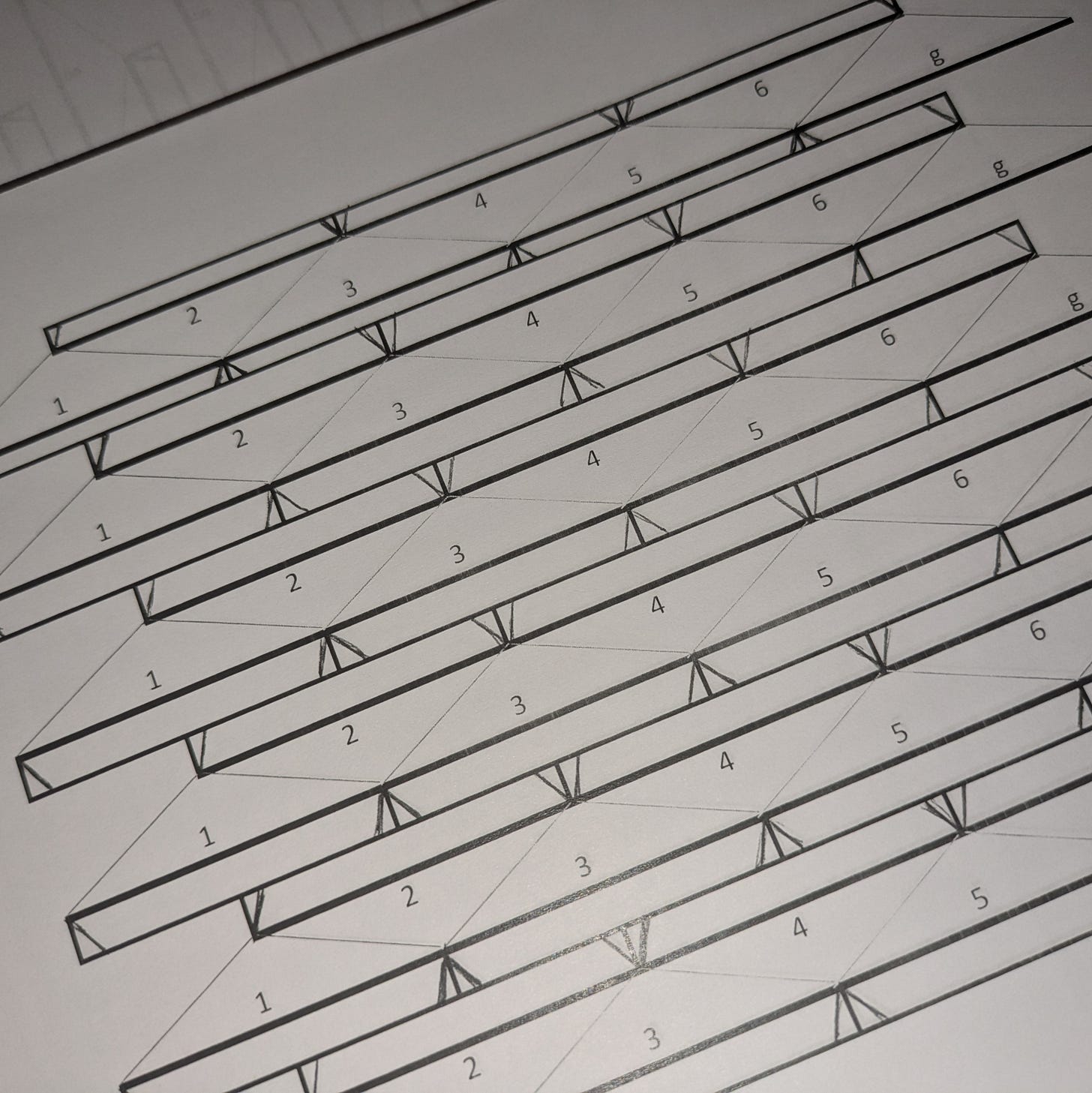 I mean the thrust here being that this took a ridiculously small amount of time to accomplish and required no printer for exactness. I just needed something that I could draw a square with repeatedly and even the fact that it's square doesn't exactly matter. it just makes pleasing triangles better. This also means that if you have access to a straight edge and a stylus the only thing limiting you for making architectural trusses is the availability of sheet metal and relevant tooling.