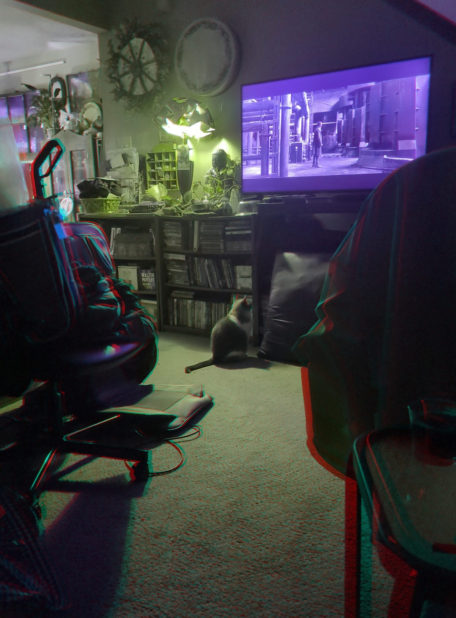 Pictured cat furr goblin gravy addict watching dramatic bit of BR2049. Now in threeedeee…!